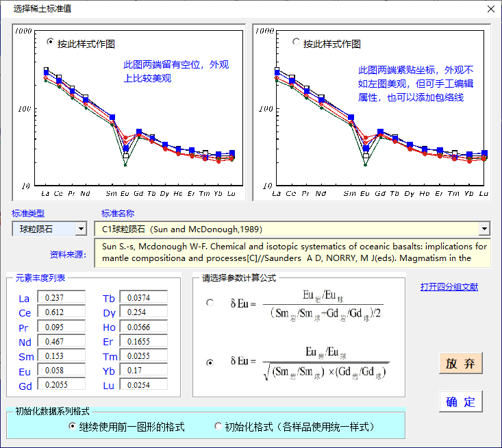 3)δEu和δCe的计算方法选择。这两个参数都有两种计算公式,第一个公式是曾经使用比较多的,而第二个公式才是正确的。