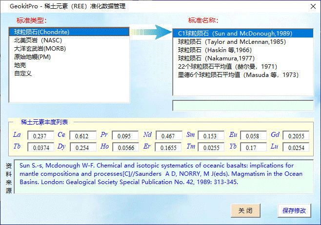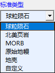 同一类标准有多组数据可以选择(详见 标准化数据管理)。选定好标准后,元素丰度栏会显示该标准的具体数值(见上图的“元素丰度列表”区)