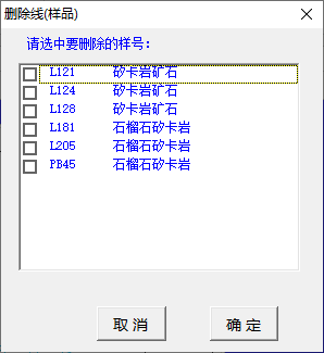 ,弹出一选择样品对话框(下图右)。对话框列出了图中的所有样品,选择要删除的样品后点击确定,即可将其从图中删除(删除后还可用添加命令将其添加到图中)。