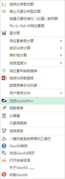 未注册的用户geokit菜单中会有一个注册GeokitPro选项(下右图)。获得授权后该菜单项及刷新菜单项将不再显示。
