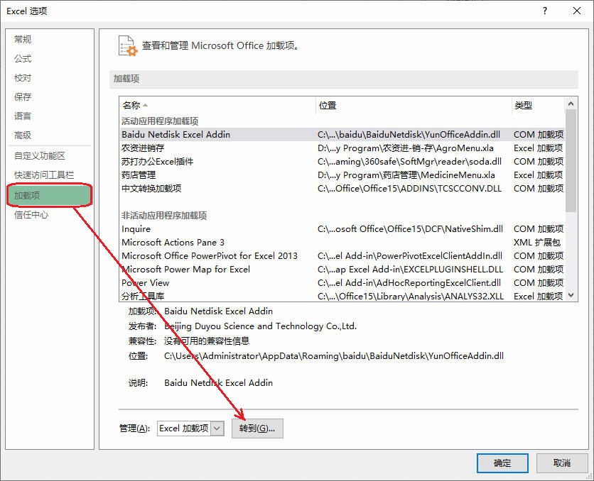 ② 点击Excel菜单 “文件”,选择 “选项”,在弹出的选项窗口中选择 加载项 -转到(G)...如下图所示: