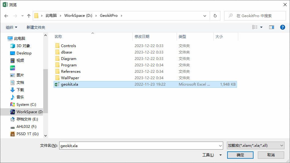然后按提示,找到安装目录中的加载宏文件(geokit.xla),再点确定即可。