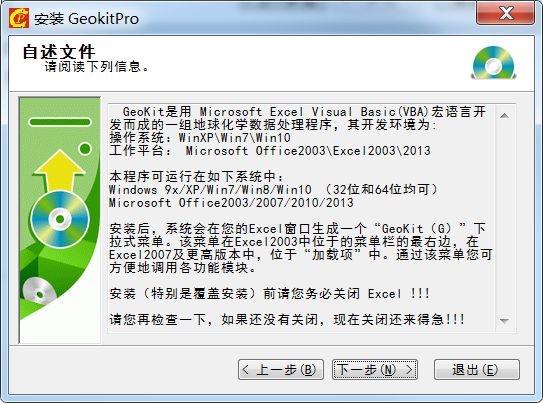 安装前请先关闭所有 Excel 文件,特别是已经安装了Geokit老版本的计算机,一定要先关闭Excel,否则无法进行更安装。