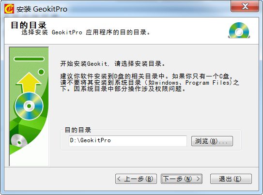 选择安装目录:默认的安装位置是 D:\GeokitPro,建议不要修改,更不要修改到系统盘(C盘)。