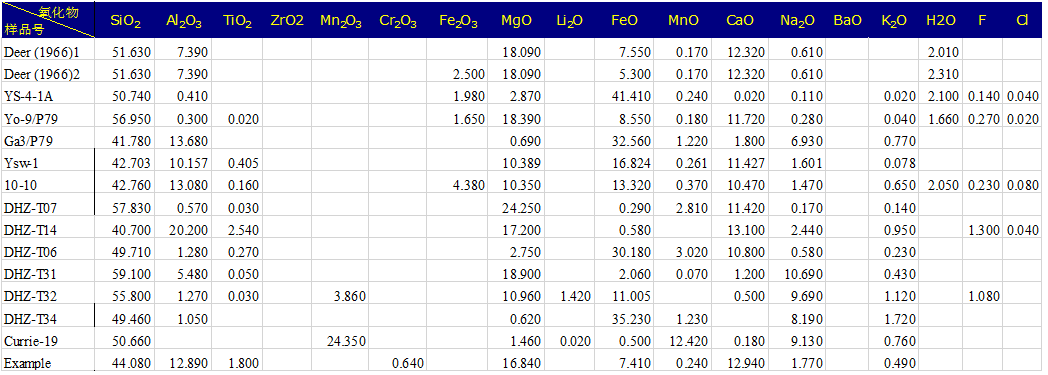 本软件包设计了常见矿物的单矿物化学式及端元分子的计算程序。目前可对橄榄石、辉石、角闪石、长石、云母及石榴子石进行计算。因各矿物计算程序的使用方法数据准备基本一致,以下以辉石和角闪石为例介绍程序的使用。