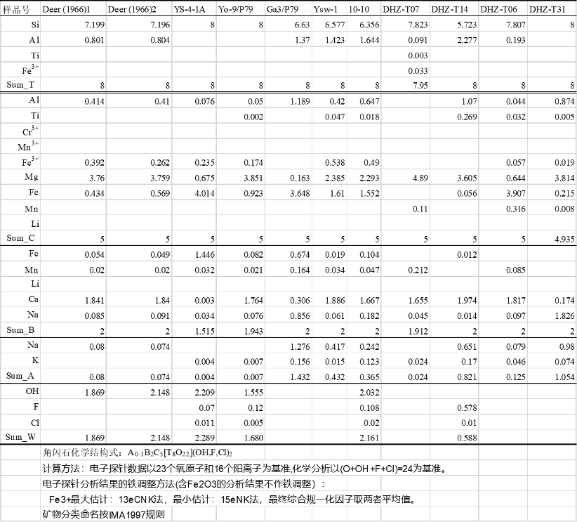 由于角闪石中的铁有三价铁(Fe3+)和二价铁(Fe2+)之分,并且两者通常是共存的。由于当前单矿物分析多采用电子探针法,而电子探针是无法区分铁的价态的,通常是以(FeO)形式给出结果,因此需要对铁进行必要的调整。Fe3+的估计方法有很多,其中有最小值(尽可能将Fe分配给Fe2+)和最大值法(尽可能将Fe分配给Fe3+),这里最大值法和最小值法各设置了三种,你可以选择其中的一种调整方法,也可以选择综合方法。选择综合方法后,会根据选择的最大值法和最小值法各自的计算结果,然后计算其平均值。作者认这,这种方法相对来说效果比较好,因此设置为默认值。