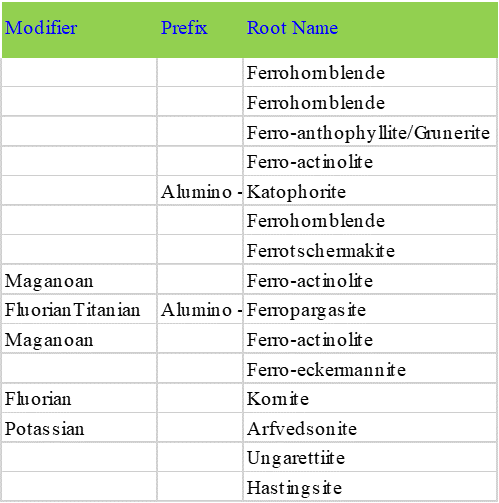 在完成角闪石化学结构式计算后,软件还设置的角闪石的自动分类命名功能,可以给出根名、前缀和修饰词,如下图所示。分类命名的结果放置在氧化物数据后面。