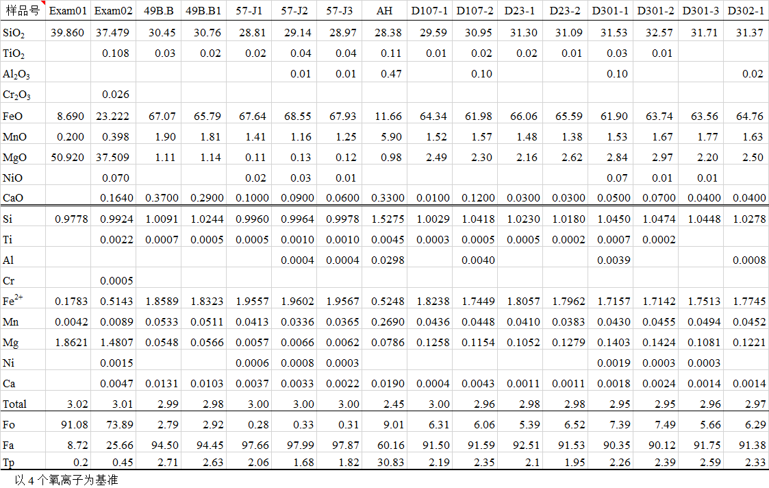 当数据准备好后,点击“橄榄石”浮动工具条中的“橄榄石晶体化学式计算”按钮 开始计算 即可完成全部计算。计算结果保存在您的分析结果数据下方,并以双线与分析数据隔开。 计算结果如下: